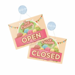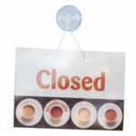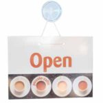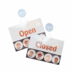 Two-sided sign that’s ideal for hanging on a shop window door. Printed in FULL COLOUR and features an elastic cord with suction cup to hang it up.