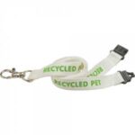 Part of an extensive range of Printed Lanyards from RT Promotions these 10mm Recycled Plastic Bottle Lanyards are part of our ECO Friendly range. Manufactured from recycled PET bottles – but with a finished quality that’s difficult to tell the difference from the best-selling polyester range. Available in three width sizes – this is the smallest. Most folk purchase them in their ‘natural’ colour – but for a small additional cost we can supply them in a range of colours too. We print with your artwork in any colour, with the artwork/branding repeating up one side and then down the other. Remember, if your artwork fits – we’ll print it on there for you. Perfect for events and conferences or even to hold your ID pass whilst on company business.