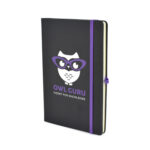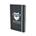 Part of an extensive range of Promotional Notebooks from RT Promotions, these A5 Black Notebooks are distinctive and classy. Manufactured with a soft PU cover – the stand out feature is that the cover on this range is Black. Featuring a contrasting colour for the elasticated band, ribbon bookmark and pen loop the package is distinctive and stylish. Comprising 80 sheets of cream lined paper and a heavy duty card back pocket in the rear, really useful for storing receipts or business cards. We offer multiple branding options onto this product, from spot colour printing to full colour digital, as well as foil blocking and debossing. Whichever method you choose they look great when branded and remember, if your artwork fits – we’ll print it on there for you.