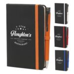 Part of an extensive range of Personalised Mini Notebooks from RT Promotions, this A6 Bowland Notebook is a great example of a pocket notebook. Featuring a Black soft finish PU cover, the contrasting colours for the detailing really stand out. Comprising 80 sheets of lined A6 paper, coloured elastic closure, pen loop and ribbon bookmark, as well as a back pocket for securing loose notes and business cards. Available in a great selection of colours, perhaps there’s a colour to compliment your brand identity? They look great when branded and remember, if your artwork fits – we’ll put it on there for you.
