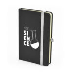 Black covers with coloured contrasting details – A6 size – PU soft finish cover – 80 sheet lined notebook.