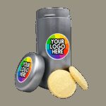 Part of an extensive range of Personalised Biscuits from RT Promotions – these Branded Biscuit Tins are a little bit different and best of all, rather yummy. These biscuits are freshly baked, with a range of flavours including; chocolate chip, shortbread, and ginger. These are a great way to boost and engage with staff or customers. The biscuit tins are topped with a full colour circular logo image, (50mm x 50mm). ALLERGENS include: wheat/milk/soya Would your logo or message work here? Packed individually in eco film. If you wish, we also offer courier delivery (specific day and POD ) and Royal Mail delivery from £2.69 – that way you can send out to your staff or clients on an individual basis. The shelf life is: 3 months from delivery. They look great when branded and remember, if your artwork fits – we’ll print it on there for you