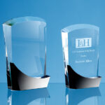 Part of an extensive range of Personalised Glass Awards from RT Promotions . There’s something special about receiving a laser engraved glass or crystal gift or award. Products in this category are built to last, so imagine how many times your branding is going to be seen? These Crystal Arch Award with Onyx Bases are available in three different sizes and look exceptional and really stand out with it’s Onyx Black Swooping Base and vivid curved shape. Made from authentic optical crystal it really gives meaning to the famous phrase “”crystal clear.”” There is generous space to personalise the award with any crest logo or wording using techniques such as colour printing sandblast engraving or 2D and 3D subsurface engraving. They are ideal recognition achievement or incentive gifts and are supplied in a beautiful presentation box. This is the smallest of the 3 sizes on offer – please contact us for pricing for the other sizes. Most folk simply want us to engrave their logo onto them, but we can do all kinds of things when personalising them, from adding individual names, and/or award categories, and in multiple positions. Whatever method and style of branding you request, this item always looks great when branded, and remember, if your artwork fits – we’ll engrave it on there for you.