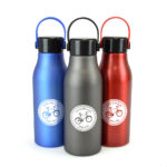 Part of an extensive range of Printed Metal Water Bottles from RT Promotions – the Dapto Drinks Bottle has a very distinctive look to it, all guaranteed to make your brand stand out from the crowd. Featuring a 680ml capacity – single walled aluminium drinks bottle with black PP plastic secure screw on lid and matching coloured silicone carry handle. This style of water bottle is very popular at the moment making them perfect as a promotional gift for people on the go! We offer a choice of branding method onto these bottles, printed, rotary wrap printed as well as laser engraved, and we can even offer individually named bottles. Whichever method you choose they look great when branded and remember, if your artwork fits – we’ll print it on there for you.