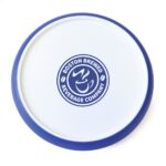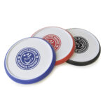 White plastic coaster with coloured silicone edge – available in White/Black, White/Blue, White/Red.