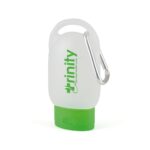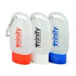 30ml pocket size hand sanitiser – coloured lid – silver carabiner clip.