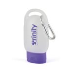 Part of an extensive range of Promotional Hand Sanitisers the Ellyson Hand Sanitiser is simple but effective. Perfect for use as a promotional giveaway for anyone coming into regular contact with members of the public, like care homes, residential homes, or Hotels and restaurants. Manufactured in white plastic but with a choice of colour for the lid – these 30ml hand sanitisers feature a handy silver carabiner clip for attaching to bags, or belts. This kind of promotional gift is practical and useful and are sure to be kept and used. They look great when branded and remember, if your artwork fits – we’ll print it on there for you.