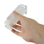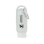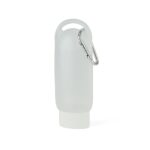 60ml hand sanitiser gel in clear plastic casing with a white flip top lid and silver carabiner to clip to your clothing, bags, belt etc