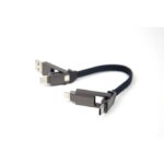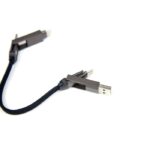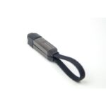 Part of an extensive range of Customised Technology Gifts from RT Promotions, this one, the Fast Charge Cable is rather special. Neat and compact, the device is mostly metal and has a satisfying, heavyweight ‘feel’ in the hand. The colour, gun metal grey is pretty cool too. Thecompact charging cables click together using magnets and a rubber cap to house the cable ends. It folds into a pocket sized 12mm, and unfolds to reveal four different plug connectors – all with ultra-fast 60w charging premium cables. Featuring 2 x USB-C, 1 x USB-A and 1 x Lightning. This is a promotional gift that is going to be kept and used for years. Imagine how many times your clients are going to see your branding? Branding is by laser engraving onto the metal clasp. They look great when branded and remember, if your artwork fits – we’ll engrave it on there for you.