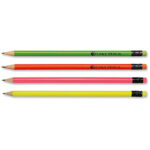 Part of an extensive range of Printed Pencils from RT Promotions these Funky Coloured Wooden Pencils are always popular. Available in a popular range of colours, and with a built-in eraser and a Black metal ferule to give a neat finishing touch – maybe there’s a colour to compliment your brand identity? Available in Green, Orange, Pink and Yellow, they look great when printed and branded and remember – if your artwork fits – we’ll print it on there for you.