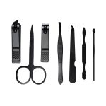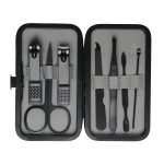 Stylish faux leather case. Includes bevelled nail scissors, flat nail scissors, tweezer, scissors, nail file, dead skin fork and straight pusher.
