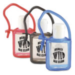 DISCONTINUED LINE – HEAVILY DICOUNTED – PLEASE CHECK FOR STOCK COLOURS – WHEN THEY’RE GONE, THEY’RE GONE – Part of an extensive range of Personalised Hand Sanitisers from RT Promotions these Mini Sanitisers are proving to be popular. Perfect for anyone coming into regular contact with members of the public, like care homes, residential homes, or Hotels and restaurants. These are promotional gifts that are practical and useful and are sure to be kept and used. Housed inside a PVC casting and with a prominent branding area offering exposure to your brand every time the sanitiser is used, these antibacterial sanitisers are available in Black, Blue and Red, complete with a matching coloured hanging loop. They’re frequently used around the workplace and are invaluable when travelling. They look great when branded and remember, if your artwork fits – we’ll print it on there for you.