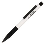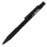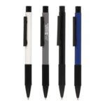 A modern metal push action ball pen with large feature clip and a silicone grip designed to enhance comfort and control, providing a non-slip experience. The black trims offer a contemporary feel.