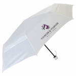 Part of an extensive range of Printed and Sustainable Umbrellas from RT Promotions – the ECO-Vent Mini is an Eco friendly manual opening telescopic umbrella with vented canopy. This Personalised ECO-Vent Mini Features a 100% recycled PET canopy with four vented panels for increased stability in windy conditions, colour co-ordinated rubber coated handle with carry strap, colour co-ordinated sleeve. Our pricing allows for printing onto just ONE panel, but for an additional cost we can print onto more if you’d like. They always look great when branded and remember – if your artwork fits – we’ll print it on there for you.