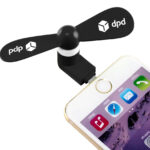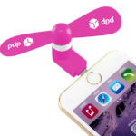 Part of an extensive range of useful Promotional Technology Accessories from RT Promotions – the Phone Fan is always a head-turner. This is a gadget that everyone will want, so it’s perfect to use as a promotional gift. Designed to simply plug into your phone or tablet and gives an instant cool breeze. We have a choice of USB, Micro USB or Lightning fitting (cheaper if you choose just ONE of these fittings), but we decided to offer you a 3 in 1 fitting – that way, no matter who you give them to, they’ll be able to power up. Do let us know if you’d prefer a cheaper/single connection though. Individually polybagged. Powered by a quiet but powerful motor, and available in a nice range of colours – perhaps there’s a colour to compliment your brand identity? The branding area onto the fan blades is quite small, and for a small additional cost, we can even print onto both for you. They look great when branded and remember, if your artwork fits, we’ll print it on there for you.
