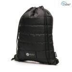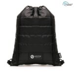 RPET polyester puffer drawstring bag with polyester rope shoulder straps and a faux leather patch
