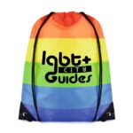 Part of an extensive range of Personalised Drawstring Bags from RT Promotions, the Rainbow Drawstring Bag makes a BIG impact and is sure to get your brand noticed. Manufactured from 210D polyester and pre-printed as seen with a horizontal rainbow print to the front and rear, the bag has black corners and black string straps. Always a popular choice for schools and colleges, but also swimming and sports clubs where these bags come in handy to just keep everything together. Offering great branding possibilities to both sides they look great when branded and remember, if your artwork fits – we’ll print it on there for you.
