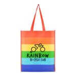 Part of an extensive range of Printed Shopper Bags from RT Promotions, the Rainbow Shopper makes a BIG impact and is sure to get your brand noticed. Manufactured from non woven PP and pre-printed as seen with a horizontal rainbow print, this 80gsm bag features long handles and a gusset. This bag makes a great promotional gift – not only is it practical and suitable for everyday use, but the large printing area means that your logo will always be seen! Excellent as a giveaway at a trade show and frequently used by businesses wanting to hand out sales literature. Offering great branding possibilities to both sides they look great when branded and remember, if your artwork fits – we’ll print it on there for you.
