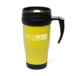 Part of an extensive range of Promotional Travel Mugs from RT Promotions – Available in TWO different styles – this one is the solid coloured finish. Sometimes referred to as the Polo Plus Mug – the Solid Colour Travel Mug is one of our more popular lines and with so many colour choices it’s not hard to see why. This double walled insulated mug is designed to keep drinks warm and is a great way to ensure your logo or message is seen by each recipient. Featuring a choice of SEVEN different coloured mugs supplied with black screw-on lids and matching coloured sip cover – is there a colour to compliment your brand identity? They look great when branded and remember, as long as your artwork fits – we’ll print it on there for you. Capacity: 400ml.