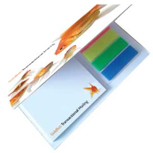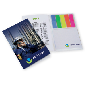 Part of an extensive range of Promotional Stationary from RT Promotions the Sticky Note Hard Back Book ticks a lot of boxes. The hard backed book is available in Red, Blue, White, Amber, Green, or Purple and it’s onto this cover that we print and personalise for you. Comprising a selection of useful yellow sticky notes and coloured flags, this is a promotional give-away that will look good on any desk. We can’t print onto either the individual page tabs or the sticky notelets, but we do print onto the front cover of each booklet and remember, if your artwork fits – we’ll print it on there for you.