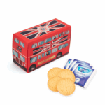 Part of an extensive range of Themed Merchandise from RT Promotions – the Tea And Biscuits Bus is rather distinctive and sure to bring a smile to each recipients face. Featuring the classic London Double Decker Bus (look closely to see some extra special passengers on-board) which is then filled with four Tetley tea bags and four shortbread biscuits. The bus design is uniquely branded and manufactured in the UK from recyclable materials. In addition to our coronation, we have left a space for you to add your own logo. They look great when branded and remember, if your artwork fits – we’ll print it on there for you