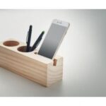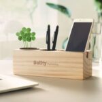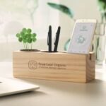 Wooden desk stand with pen and phone holder and clover seeds.